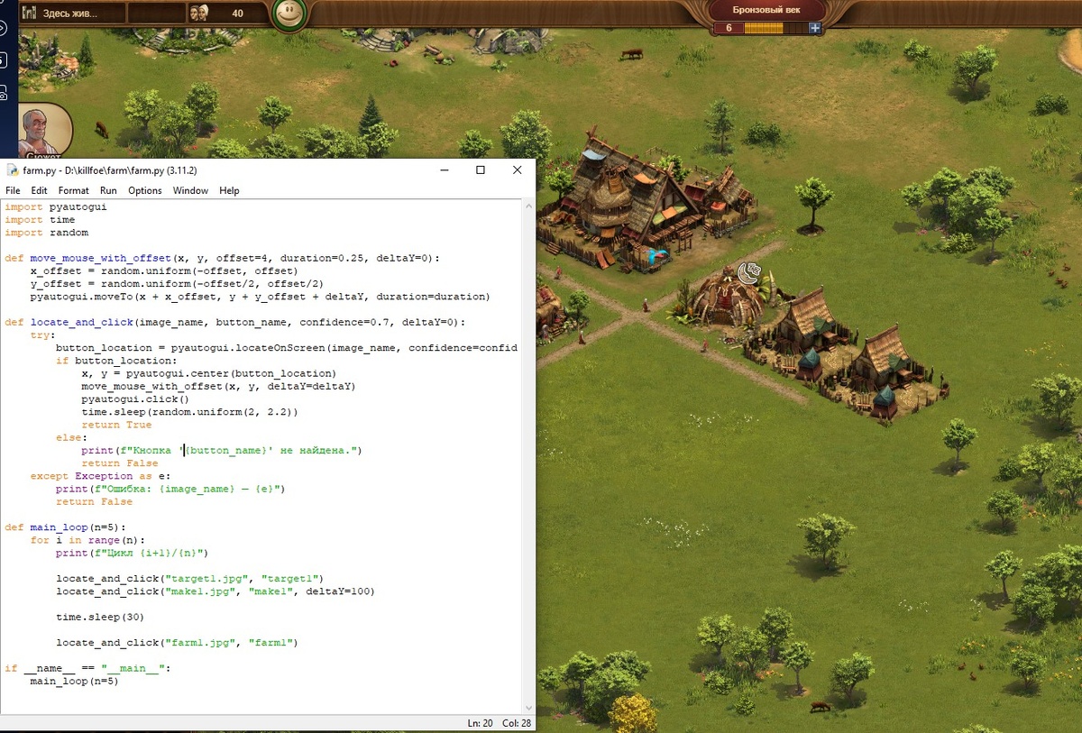 Привет! 👋 Если вы здесь, значит, вы уже устали кликать по одним и тем же кнопкам в Forge of Empires (FoE), или просто хотите научиться писать полезные скрипты. Сегодня мы начнём с простого — автоматизируем сбор ресурсов в "Доме охотника", где можно получить 7 молотков за 30 секунд. Это идеальный стартовый пример, чтобы понять, как работают боты на основе **PyAutoGUI**. 💡 Моя цель — не просто показать рабочий код, а объяснить каждую строчку так, чтобы вы могли написать свой собственный скрипт под свои нужды. Поехали! Установите зависимости: bash pip install pyautogui opencv-python pillow ⚠️ PyAutoGUI работает только на Windows, macOS и Linux с X11. Для других систем потребуются дополнительные инструменты. Весь наш скрипт делится на три части: 🐭 move_mouse_with_offset — добавляем человечность Игры могут блокировать ботов, если они обнаруживают слишком точное поведение. Мы добавляем "случайный шум" к координатам курсора, чтобы он двигался как живой человек. - x, y — центр найденного и