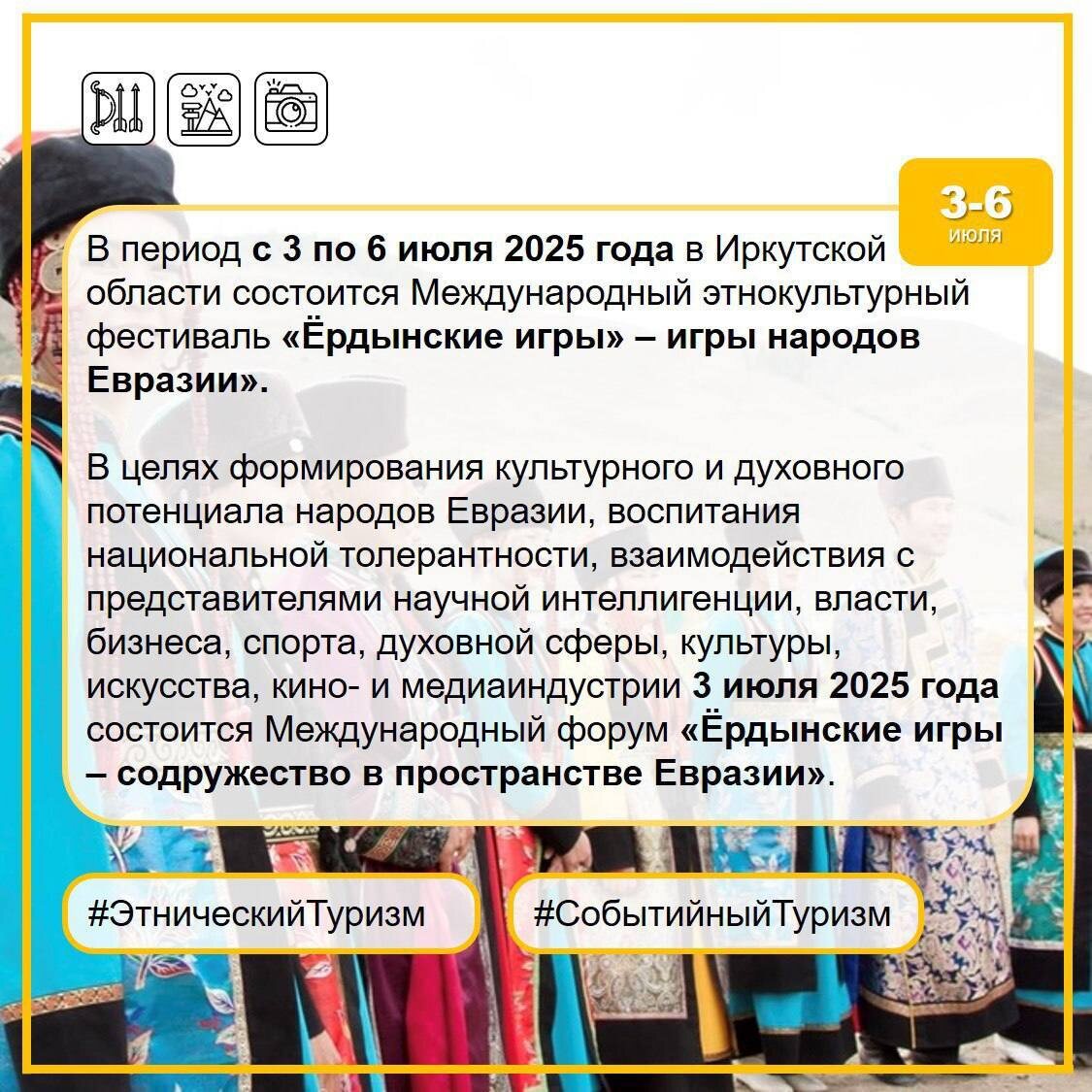 3-6 июля 2025 года в Иркутской области состоится Международный этнокультурный фестиваль «Ёрдынские игры» – игры народов Евразии», а также тематический форум «Ёрдынские игры – содружество в пространстве Евразии».