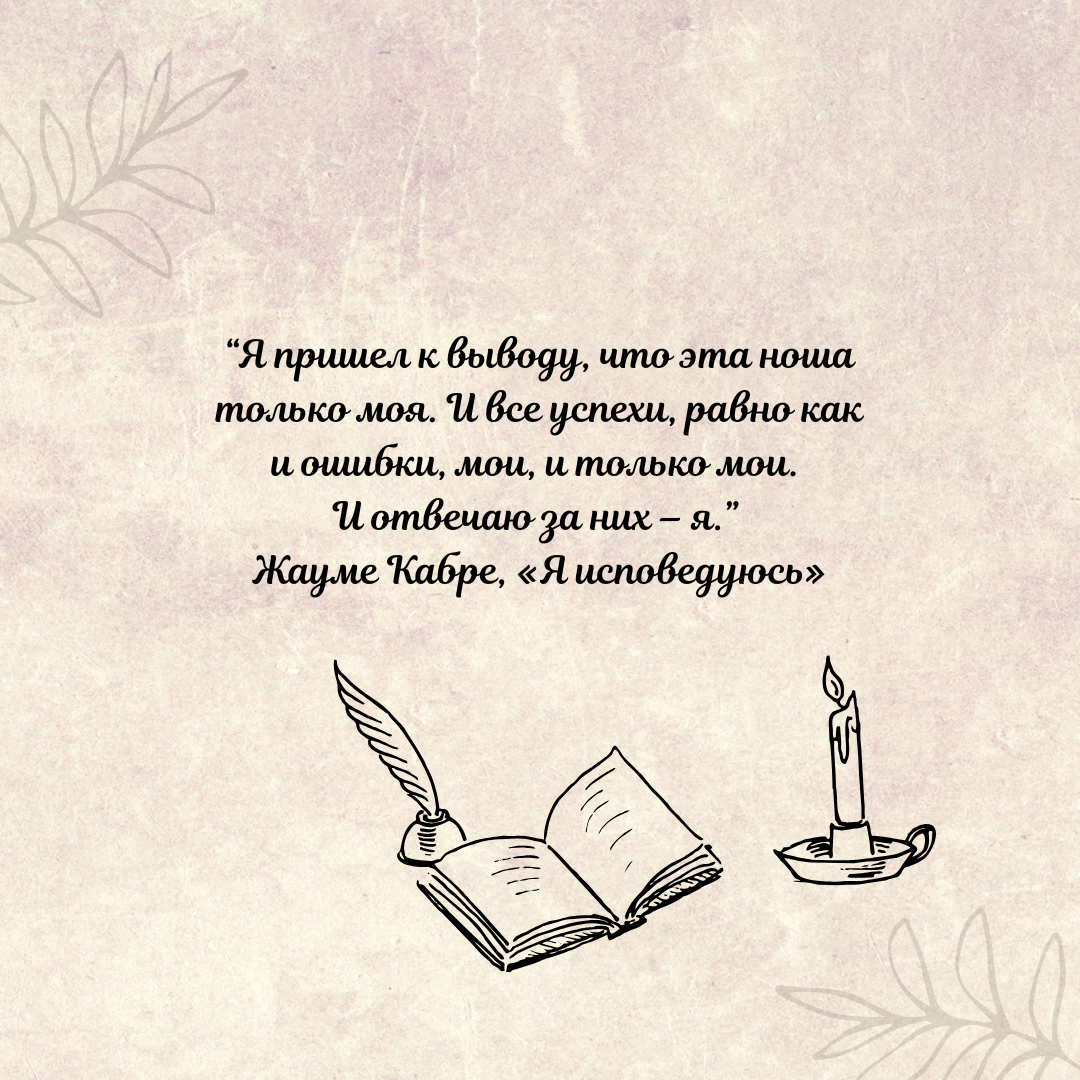 "С возрастом, размышляя о жизни или принимая решения, я привык опираться, словно на костыли, на смутные представления, почерпнутые из разных книг. Однако вчера — во вторник, ночью, — пережидая дождь по дороге от Далмау, я пришел к выводу, что эта ноша только моя. И все успехи, равно как и ошибки, мои, и только мои. И отвечаю за них — я. Мне потребовалось шестьдесят лет, чтобы осознать это." 📖 Жауме Кабре, «Я исповедуюсь» Эта цитата из романа "Я исповедуюсь" Жауме Кабре затрагивает тему, которая глубоко резонирует со мной. Как часто, пытаясь обрести уверенность в этом сложном нестабильном мире, мы обращаемся к страницам книг, чтобы найти ответы, почувствовать опору или просто немного прояснить собственные мысли. Мы находим в них вдохновение, нравственные ориентиры, даже модели поведения. Книги становятся нашей поддержкой, помогая двигаться дальше, когда нам не хватает собственных сил. Однако в этой поддержке таится и угроза. Неполные знания, выхваченные из контекста, могут быть обманчи