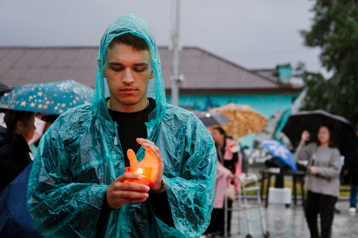 Несмотря на плохую погоду, жители города собрались у мемориала Воину-освободителю и зажгли свечи в память обо всех, кто отдал жизнь во имя Великой Победы.