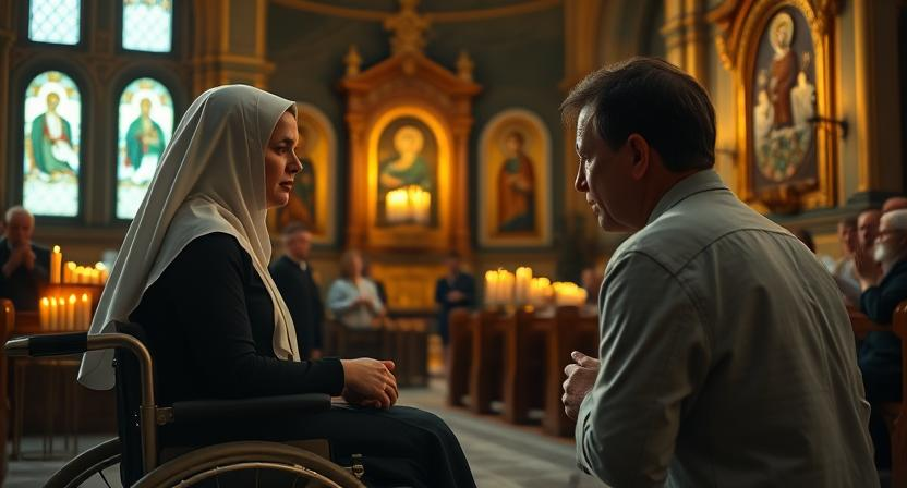 Лена выписалась из больницы в инвалидной коляске. Казалось, жизнь закончилась — её больше ничего не держало в этом мире. Она решила уйти в монастырь и доживать свои дни там. После лечения у неё оставалось совсем немного денег, и эти деньги она пожертвовала церкви.