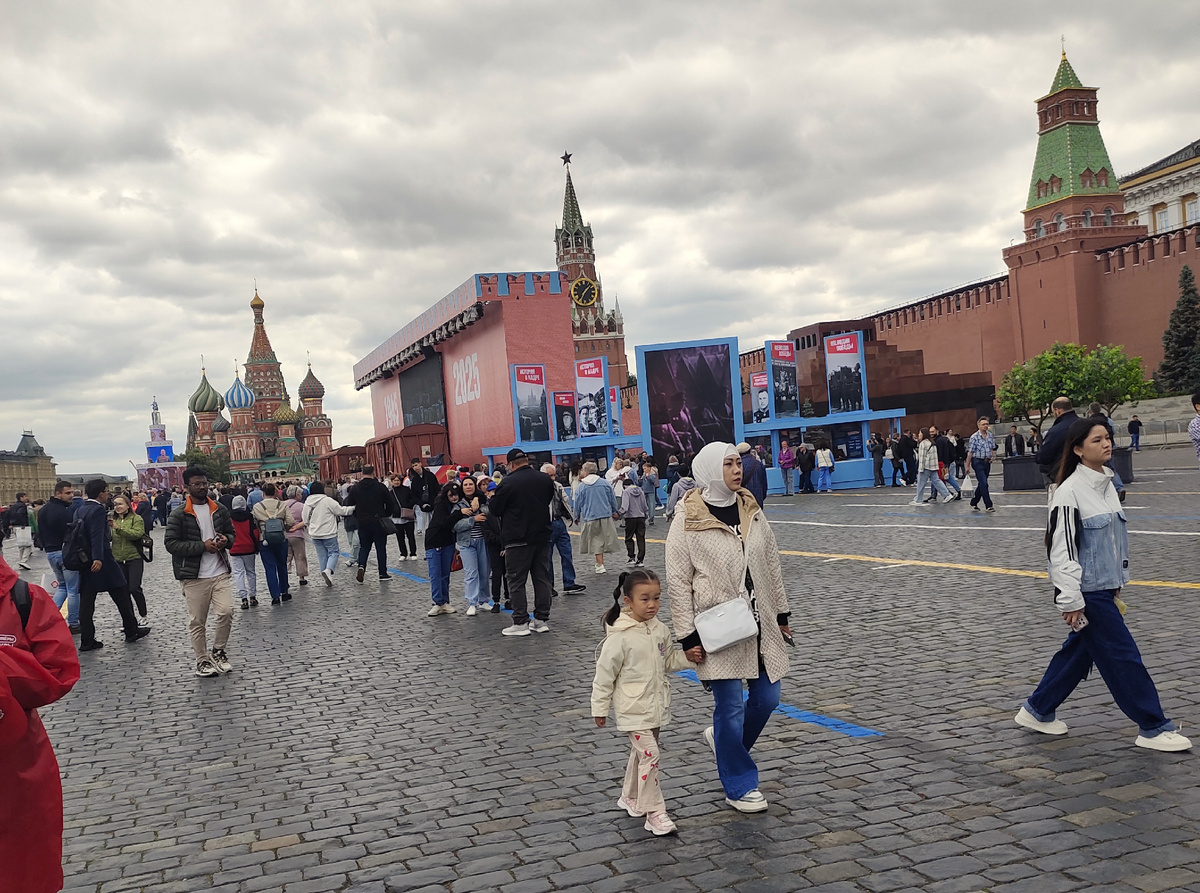 Всем привет дорогие друзья! Лето в том году никак не хочет нас порадовать солнечными деньками. Но Москва не дает скучать в любую погоду. Поэтому, несмотря на непогоду, вчера я отправилась на Красную площадь и предлагаю вашему вниманию свой фоторепортаж с места событий. . У меня была информация, что на Красной площади проходит выставка посвященная 80-летнему юбилею парада Победы. И это действительно было так. На Красной площади было очень много народу. Кругом была выставлена техника времен ВОВ. Это были и танки Т-34 и самолеты, и орудия и даже мотоциклы и автомобили. Вдоль кремлевской стены устроили выставку портретов героев войны и описание знаковых сражений. Артисты исполняли песни военных лет. А за их спиной, на огромном экране транслировались кинохроники времен ВОВ. Особенно меня поразили "ожившие", при помощи ИИ портреты героев. Но и сам рассказ о ВОВ войне тоже был интересным. Я успела посмотреть репортаж о Курской битве. Народу посмотреть спектакль собралось немало. На ней