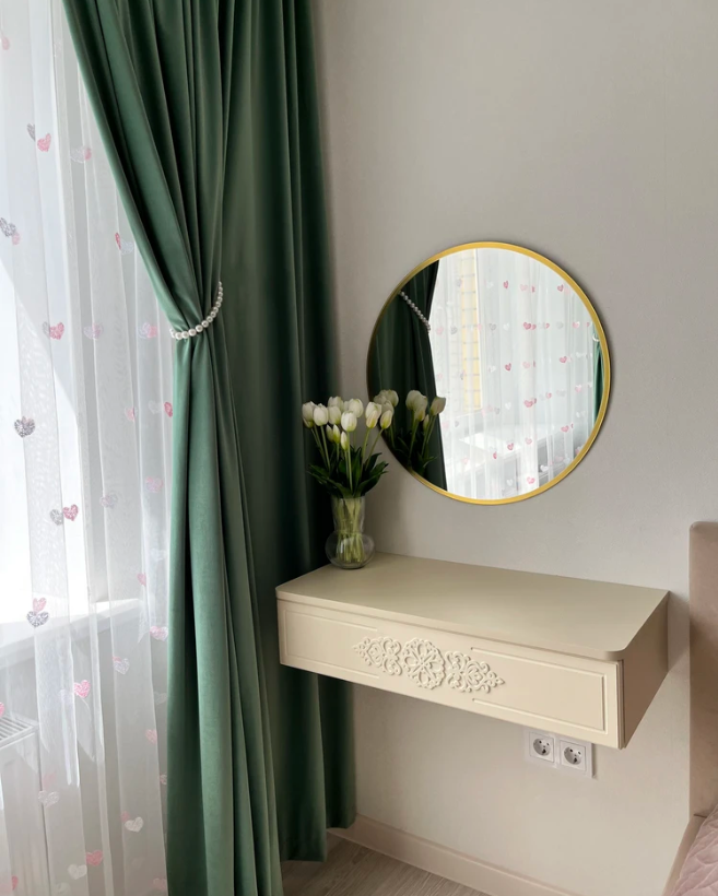 Зеркало отличное. Качество радует! Взяла диаметром 80 см в рамке. Подходит везде: в прихожую, спальню, ванную... Отличный выбор для любого помещения!