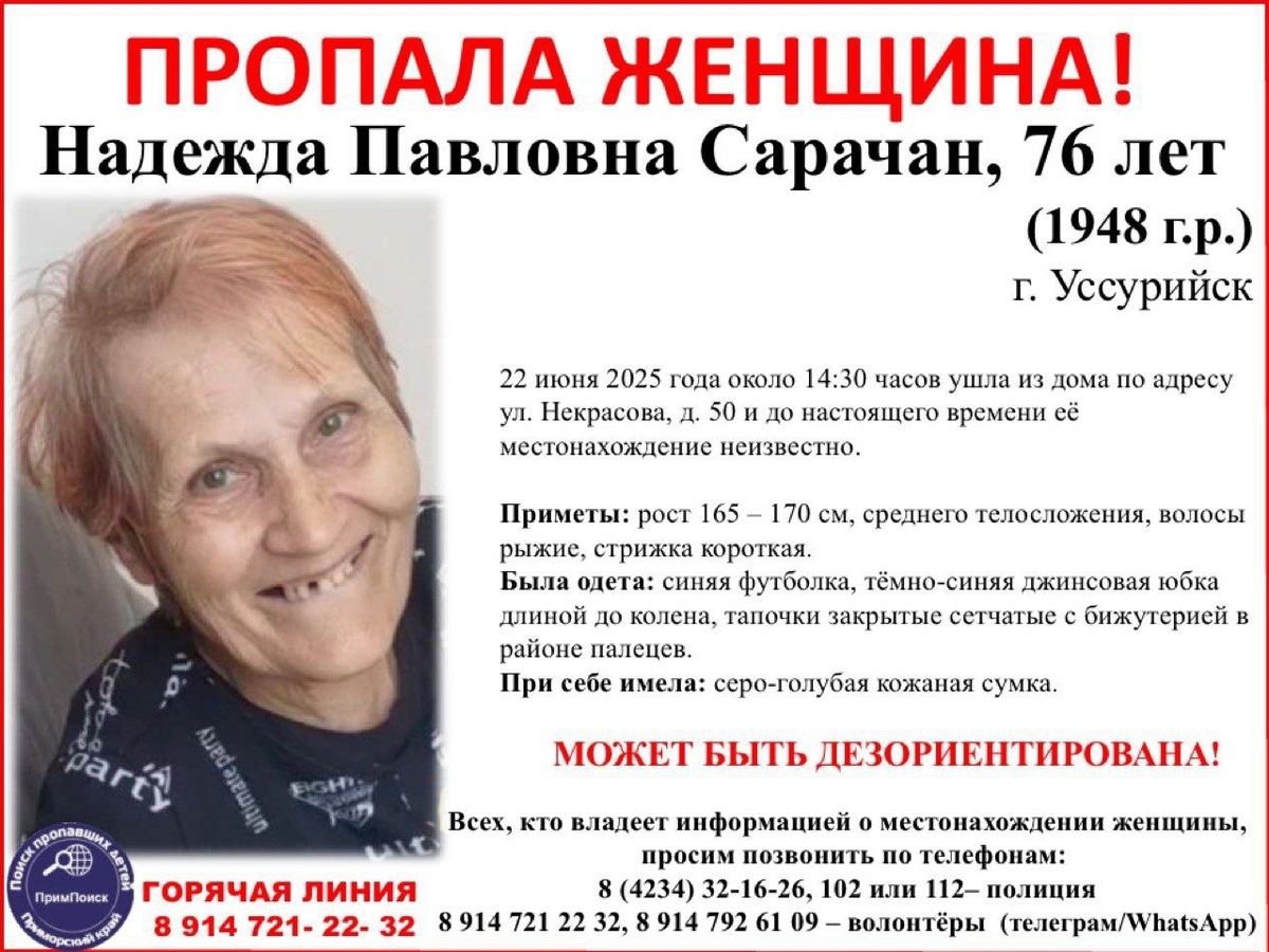 22 июня 2025 года около 14:30 часов ушла из дома по адресу ул. Некрасова, д. 50 и до настоящего времени её местонахождение неизвестно.
