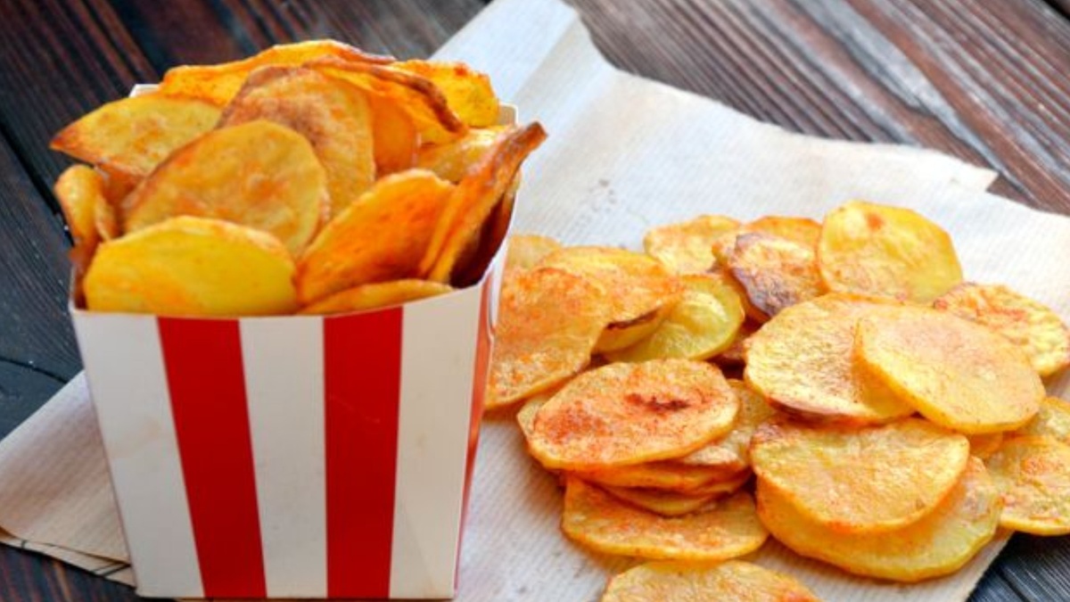 Домашние картофельные чипсы, приготовленные в духовке, по вкусу и хрусту не уступают магазинным. Но в отличие от них, вы точно знаете, что в состав входят только натуральные ингредиенты. Поэтому такие чипсы можно есть и детям, и взрослым. Специи можно добавлять по своему вкусу, делая чипсы острыми, пряными или просто солёными. Картофель необходимо тщательно промыть и очистить от кожуры. Затем следует нарезать клубни на кружочки одинаковой толщины, примерно 1,5–2 миллиметра. Положите очищенный картофель в ёмкость и залейте его прохладной водой. Дайте постоять 5–7 минут, чтобы вымыть крахмал. Слейте воду и выложите ломтики картофеля в один слой на чистое кухонное полотенце, чтобы они обсохли. Разогрейте духовку до 180 градусов. Картофель снова переложите в сухую миску. Посолите, добавьте паприку и растительное масло. В этом блюде можно использовать разные приправы, ориентируясь на свои предпочтения. Соедините кусочки картофеля с приправами и маслом, равномерно распределив их по поверхно