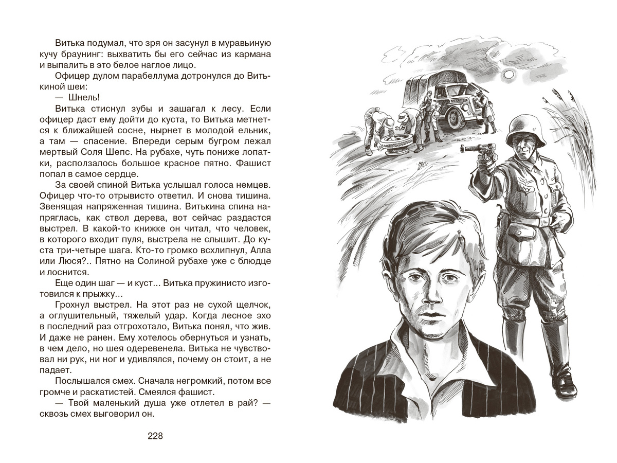 Ребята спали, и снились им разные сны. И никому из них не снилась война. А война началась. Она только что прогудела над ними в чистом утреннем небе. Ребята спали, а где-то на границе уже сражались с фашистами наши бойцы, палили пушки, строчили пулеметы. Самолеты с черными крестами налетели на спящие города, и бомбы с отвратительным визгом летели вниз. Многие в это воскресное утро погибли, так и не поняв, что же такое произошло, не поняв, что началась война суровая и жестокая, перед которой померкли все остальные войны.