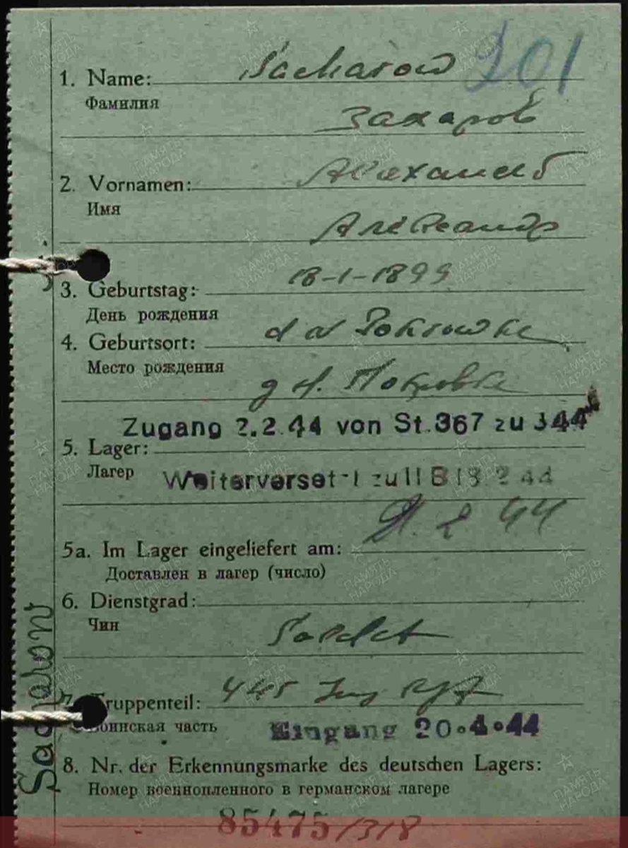 Александра Прохоровича Захарова призвали на фронт 18 октября 1941 года. Был он командиром взвода 440 стрелкового полка 64 стрелковой дивизии. 12 июля 1942 года попал в плен на Харьковском направлении в Старом Осколе. Перед пленением воевал в 449 гаубичном артиллерийском полку.