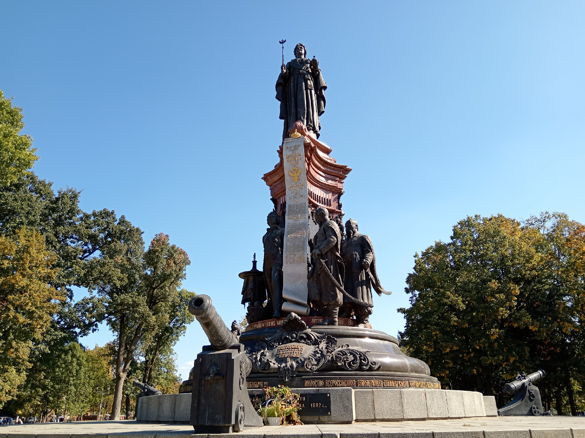Центральная фигура — сама императрица в парадной порфирной мантии, со скипетром и державой в руках. По одну сторону от нее расположился князь Потемкин-Таврический на фоне боевых знамен, по другую скромно пристроились три первых кошевых атамана: Антон Головатый, Сидор Белый и Захарий Чепега. На постаменте развернут текст Жалованной грамоты. Только представьте, для изготовления памятника потребовалось 25 тонн бронзы, 12 тонн чугуна, 250 кг алюминия и примерно 80 гр сусального золота!