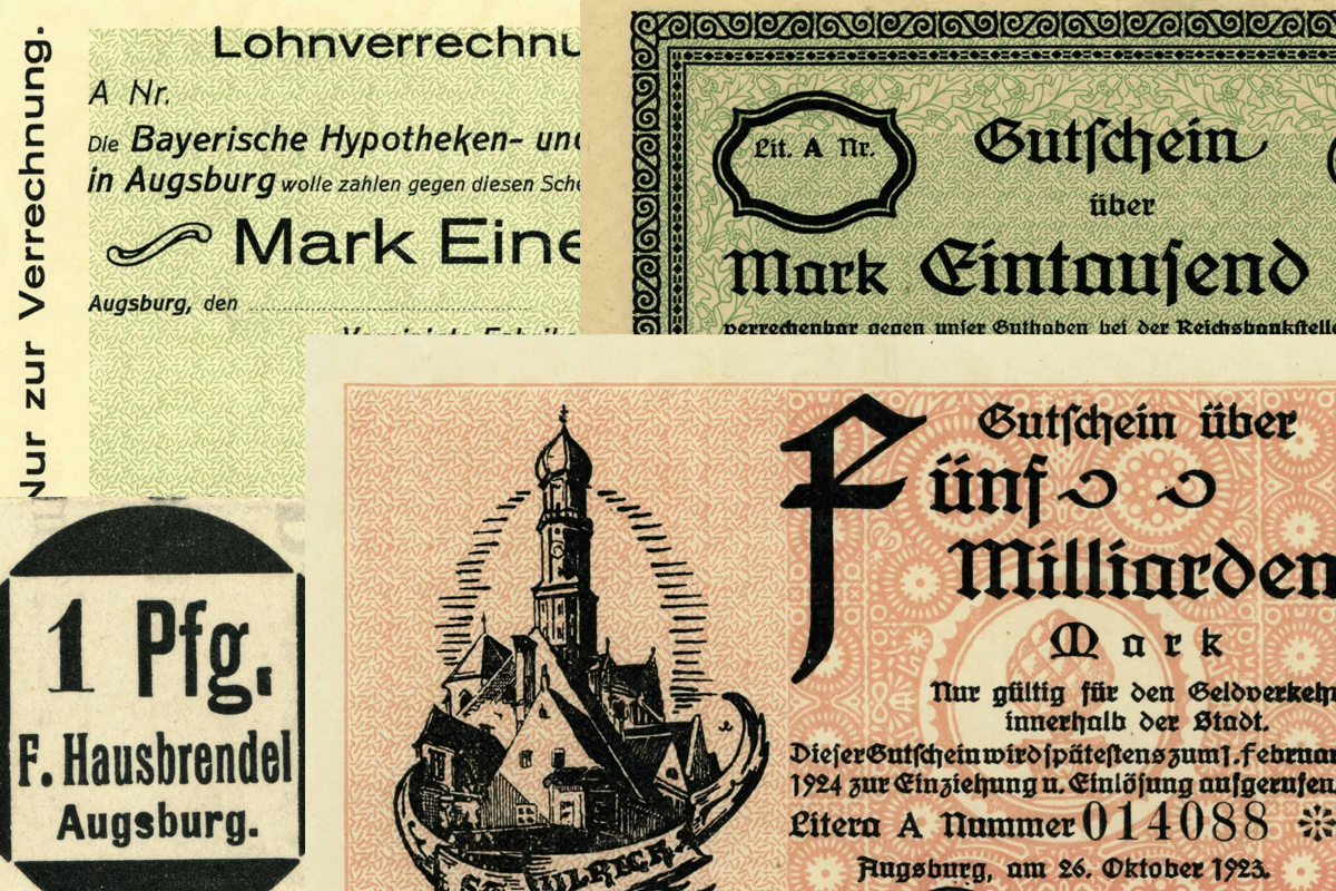 Город Аугсбург в Швабии выпустил первые чрезвычайные деньги ещё во время Первой мировой войны. Эти ваучеры номиналом ½ марки 1917 года были напечатаны типографией И. П. Гиммера. Иоганн Петер Гиммер (1801-1867) основал типографию и издательство в Аугсбурге. В период с 1917 по 1920 год семейное предприятие производило нотгельды для многих баварских городов. За простым выпуском 1917 года последовали другие небольшие выпуски в период с 1918 по 1920 год. На них был изображён герб города и различные достопримечательности, например, ратуша Аугсбурга, одно из самых значительных светских сооружений архитектуры эпохи Возрождения к северу от Альп. Ратуша вместе с Жемчужной башней, также изображенной на ней, является символом города. Помимо города, многочисленные городские компании также выпускали мелкие банкноты в период с 1916 по 1920 год. Так, типография И. П. Гиммера выпустила для своих служащих в 1916 году талоны номиналом 5, 10, 25 и 50 пфеннигов. Известно более 20 других торговых точек, сре