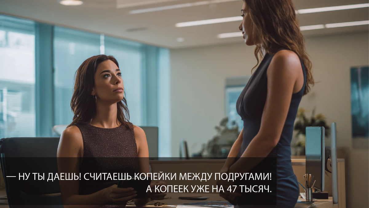 — Стой-стой-стой! — Алена подняла руки. — Ну ты даешь! Мы же друзья! Ты прямо как... как банкир какой-то. Считаешь копейки между подругами!