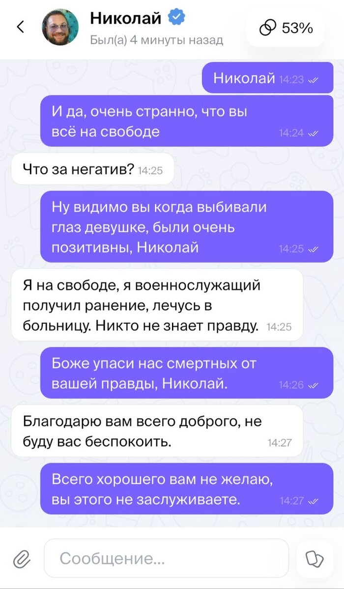 «Любящий, отзывчивый, добрый» – так описывает себя Николаев Алиев, лишивший глаза свою бывшую девушку, на сайте знакомств. Также мужчина сообщает, что знает азербайджанский и иврит, и резко негативно относится к курению. 36-летний Алиев активно знакомится с девушками на сайте Твинби. Одна из девушек, которой писал мужчина, сообщила об этом Ксении Душановой, пострадавшей от мужчины. Девушка, по имени Оксана, высказала ловеласу, что думает о нем и удивилась, что он находится на свободе. В ответ Алиев ответил, что он военнослужащий, который получил ранение. Эту информацию Ксении Душановой, лишившейся глаза из-за Алиева подтвердили в Следственном Комитете Сочи. Ей сообщили, что бывший молодой человек Ксении вместо наказания заключил контракт с Минобороной, поэтому следствие было приостановлено. А потом попал в госпиталь. Нахождение в Сочи в СК отрицали. При этом сам Алиев публиковал в своем тг-канале видео, что он переехал жить в Красную Поляну, а также публиковал видео из ночных клубов. В