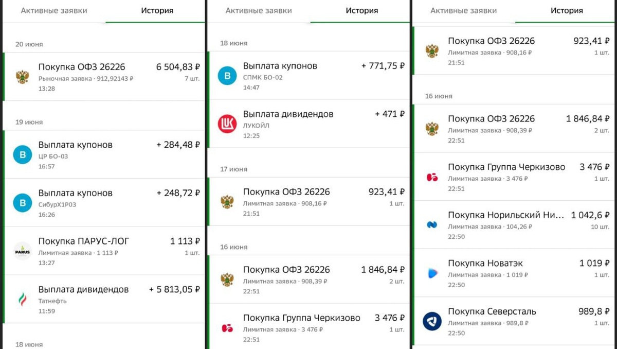 Подведем итоги недели с 16 по 22 июня ✅Пришли выплаты: - Парус Лог - 933,33₽, - Парус Норд - 544₽. - Дивиденды Лукойл – 471₽ за 1 шт, - Дивиденды Татнефть - 5813,05 за 150 шт, Дивиденды ФосАгро - 151₽ за 2 шт, - Купоны СПМК – 771,75₽ за 22 штуки, - Купоны ЦентрРезерв - 284,48₽ за 22 шт, - Еврооблигации Сибур – 248,72₽ за 4 шт. ✅На счет в IB пришли выплаты: - PagSeguro - $0,70 за 5 акций, - Kronos - $0,22 за 7 акций, - Realty Income - $1,5 за 8 акций. Всего за неделю поступило 9200₽. 📌На дивиденды и пополнения докуплено: - 1 акция Черкизово, теперь в портфеле 22 акции. - 1 лот НорНикеля, - 1 акция Новатэк, - 1 акция Северсталь, - 10 ОФЗ 26226, - 1 пай Парус Лог. 🚕УК Полет произвела выплату за май. Доходность оказалась снова низкой, но выше, чем в прошлые 4 месяца: Рапид - 12,8% годовых, грузовой Ларгус – 18,42% годовых. Денежный поток за неделю вырос на 458₽ до 21496₽.
