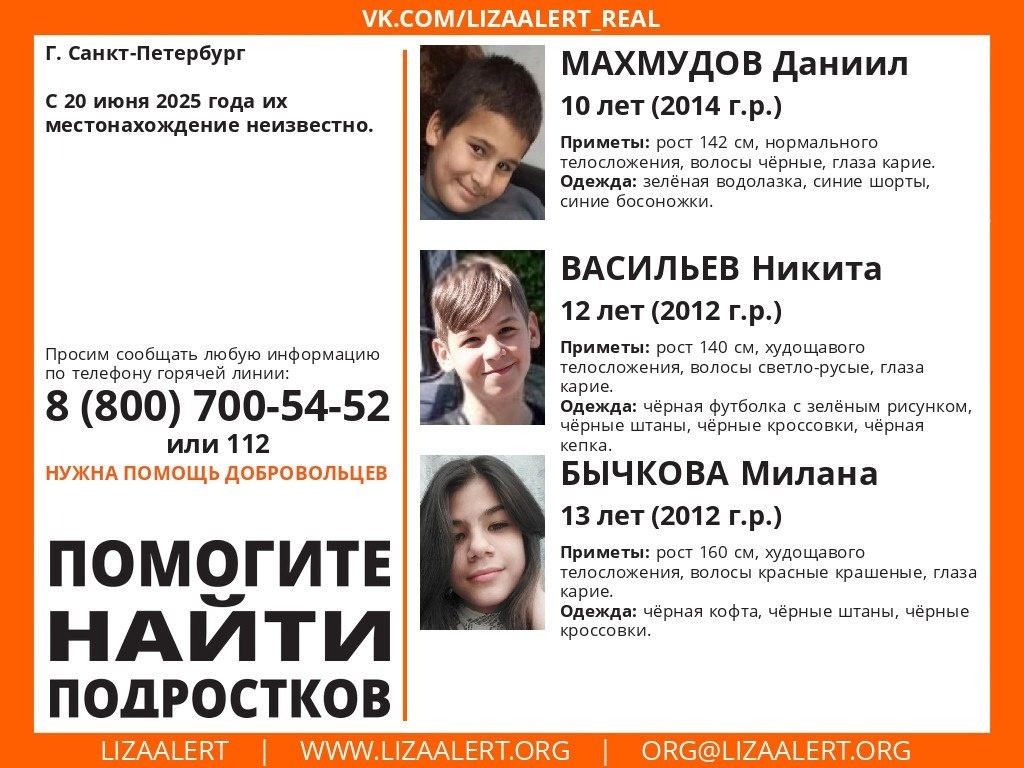 Трех детей третьи сутки ищут в Петербурге С 20 июня в Петербурге неизвестно местонахождение троих подростков: десятилетнего Даниила Махмудова, 12-летнего Никиты Васильева и 13-летней Миланы Бычковой. — Дети из благополучных семей. Вероятно, их подговорила девочка. Милана и Даниил - предварительно, брат с сестрой, — сообщил источник «КП-Петербург». Добровольцы просят откликнуться всех, кто может знать что-либо о месте нахождения подростков. Информацию можно сообщить по телефону горячей линии 8 (800) 700-54-52 или по номеру 112. 📷: t.me/aakhort Подпишись на Комсомольскую правду: СПб — отдай свой буст нам