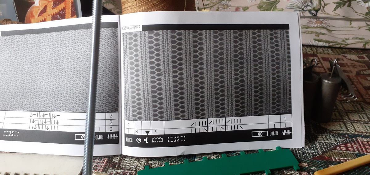 Все иглы вяжут. Рычаги "на себя". Узор на одной фонтуре. 1 цвет нити. Узор формируется за 2 ряда. Это рассказала нам карта узора 7. Ажурные дорожки из 2х петель через три лицевые образуются путем перекидывания петли то вправо, то влево. Отбираем иглы 1 накид, 5 лицевых. (По карте надо 4 лицевых. Ошибочку допустила) Проводим 1 раз кареткой. Образовался 1 ряд с накидами через 4 петли. В противоположную сторону от накида перевешиваем одну соседнюю петлю. И так далее. Чередуем 1 и 2 ряд узора. А если у Брунелло Кочунели посмотреть... То захочется таким узором связать хотя - бы маечку. 🙊