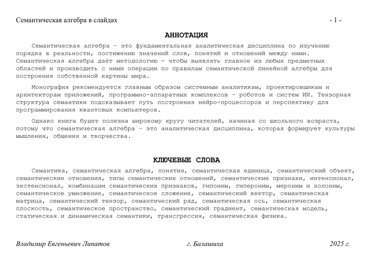 Семантическая алгебра – это фундаментальная аналитическая дисциплина по изучению порядка в реальности, постижению значений слов, понятий и отношений между ними. Семантическая алгебра даёт методологию - чтобы выявлять главное из любых предметных областей и производить с ними операции по правилам семантической линейной алгебры для построения собственной картины мира. Монография рекомендуется главным образом системным аналитикам, проектировщикам и архитекторам приложений, программно-аппаратных комплексов – роботов и систем ИИ. Тензорная структура семантики подсказывает путь построения нейро-процессоров и перспективу для программирования квантовых компьютеров. Однако книга будет полезна широкому кругу читателей, начиная со школьного возраста, потому что семантическая алгебра – это аналитическая дисциплина, которая формирует культуры мышления, общения и творчества. Семантика, семантическая алгебра, понятия, семантическая единица, семантический объект, семантические отношения, типы семантич