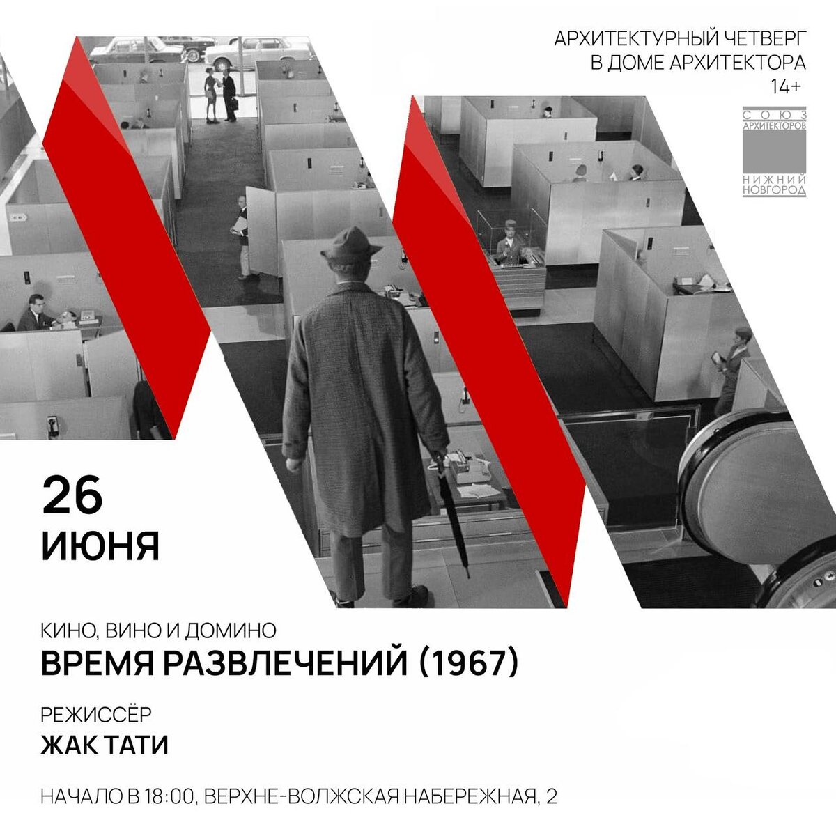 В четверг, 26 июня, просмотр комедии Жака Тати «ВРЕМЯ РАЗВЛЕЧЕНИЙ»!