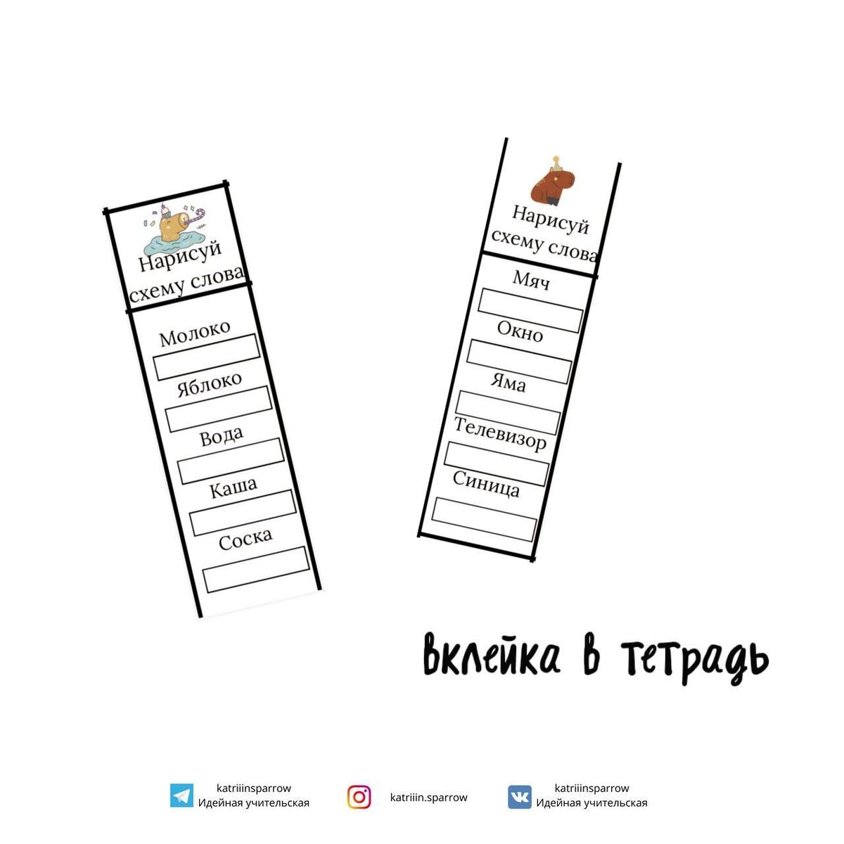 Нарисуй схему слова. Помню когда училась в начальной школе, мы рисовали схемы аж до 4 класса. Как же я их ненавидела… И спустя 10 лет поняла почему 🙈 мне трудно давались эти разделения квадратов, синий или зеленый цвет, все казалось очень сложным. А причина в том, что нам четко не объяснили как делить этот прямоугольник палками, почему мы что-то делим пополам, почему мягкий это зеленый, а твердый это синий, почему мы не можем закрасить синим и зеленым один квадратик… ну или я плохо слушала, не отрицаю, скорее всего так и было 🙈😅 Но изучив все свои ошибки, пробелы и проблемы, я стараюсь не допустить их когда объясняю эту тему детям🤓 Наберем 15 реакций и выложу следующий пост❤️🔥 Файл в комментариях👇🏻