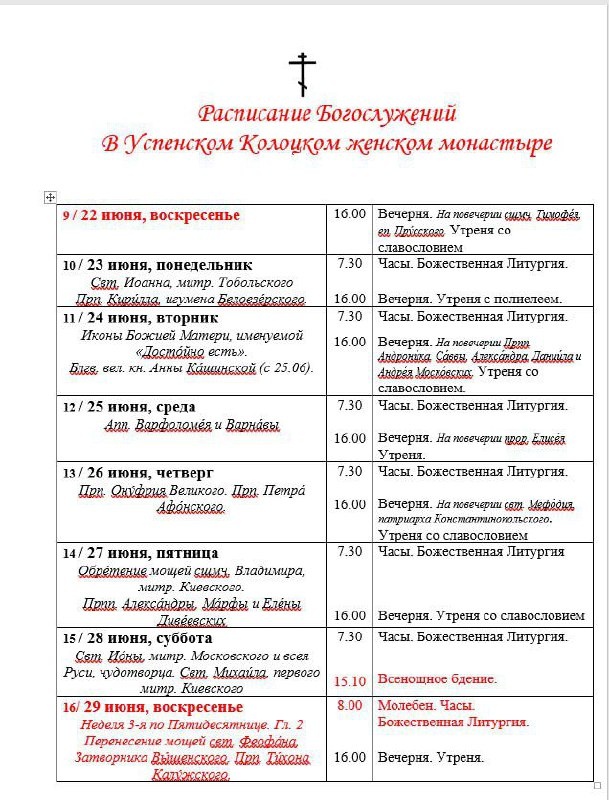 #расписание@kolockiymonastyr КОЛОЦКИЙ МОНАСТЫРЬ