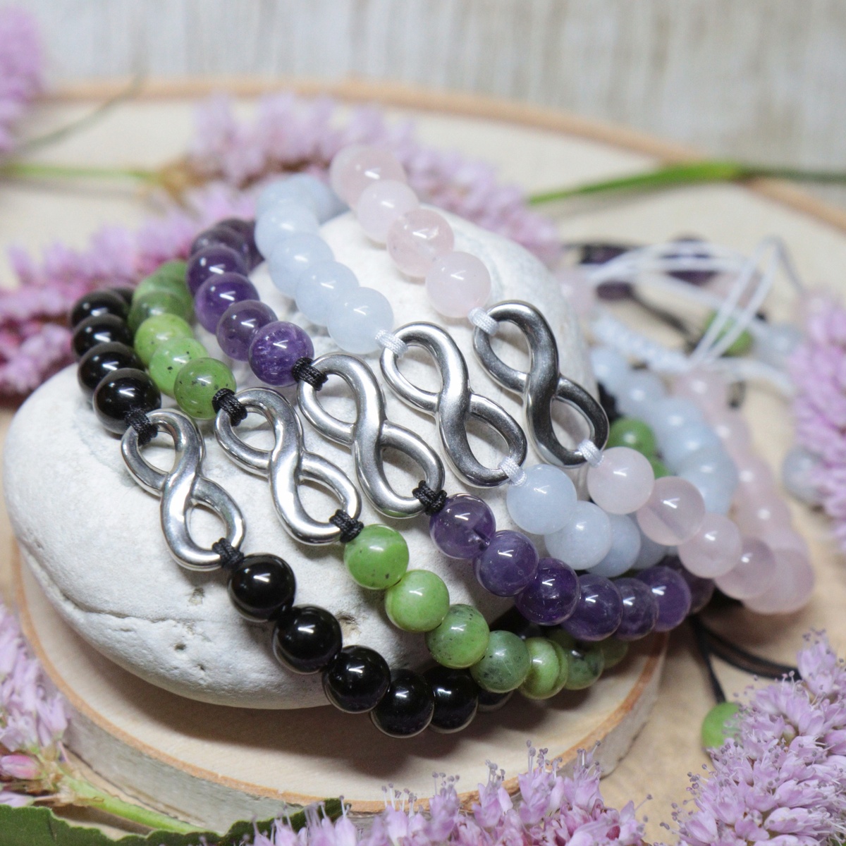Натуральные камни в сочетании с символом бесконечности из нержавеющей стали хранят в себе особый смысл и могут стать приятным напоминанием о чем-то важном. Розовый кварц символизирует искреннюю светлую любовь, голубой берилл наполнен духом путешествий и открытий, зеленый нефрит олицетворяет гармонию с природой, аметист - это мудрость, проницательность, таинственность, а черный турмалин воплощает силу, защиту, загадочную атмосферу ночи. Но каждый браслет раскроет свои секреты и обретет настоящую уникальность только в руках своего человека, поэтому обязательно зарядите их счастливыми моментами и приятным воспоминаниями ✨ Браслеты сплетены на двойной нейлоновой нити. У светлых браслетов светло-серая нить, у темных - черная. Диаметр бусин около 6мм. Размеры браслетов получились немного разными: Нефрит, розовый кварц и берилл подойдут на запястье 14-15.5см Аметист и черный турмалин - на запястье 15-16.5мм. Камни натуральные, в них могут быть включения, незначительные неровности и другие при
