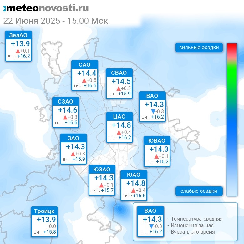 В 15:00 в Москве было от +13.6°C до +15.7°C, средняя температура +14.4°C #погода #Москва #лето #температура #22июня #воскресенье