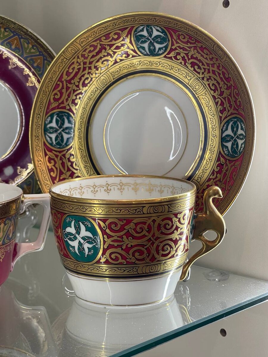 Сегодня перед нами чайные пары, изготовленные на предприятиях семьи Кузнецовых, украшенные орнаментальной росписью. Орнамент — это род композиции, построенной на регулярном, ритмически упорядоченном расположении (чередовании) абстрагированных или изобразительных элементов. Если отбросить эмоциональную составляющую, то применяя только факты, можно смело назвать сегодняшние орнаментальные чашки украшением любой полочки в шкафу. Будь это музейный шкаф или домашний буфет. Исторически орнаментальные узоры носили символический характер, но постепенно этот смысл утратился, и орнамент стал выполнять только декоративную функцию. Но мне кажется, что в каждом орнаменте все же заложен некий символизм и смысл. Элементы орнамента, как правило, «говорят» нам о том, какой смысл вложил в них автор, надо только суметь «услышать речь творца». Большинство сегодняшних чашек украшены фризовым орнаментом с использованием элементов византийского стиля. Я бы хотела обратить ваше внимание на предметы с фото 3 и