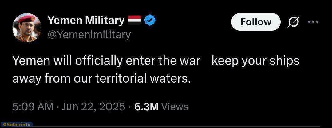 Яхья Сари: Йемен официально вступит в войну. Держите свои корабли подальше от наших территориальных вод.