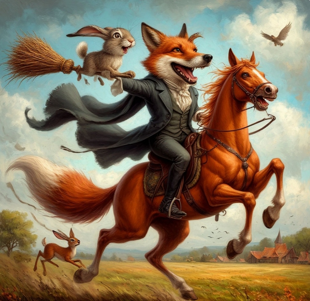 После весёлой гонки лиса решила, что пора научить зайца петь. Ведь песня — это не только весело, но и помогает держать ритм, а значит, и быстрее летать на метле! — Заяц, — сказала лиса, — если хочешь летать быстрее, надо петь громко и уверенно. Начнём с простой песенки! Заяц вздохнул и попытался пропеть: — Ла-ла-ла... эээ... ла-ла-ла... Лиса рассмеялась: — Не волнуйся, у тебя всё получится! Главное — практика и хорошее настроение. Тем временем собака решила, что тоже хочет освоить метлу. Она подошла к зайцу и сказала: — Заяц, научи меня летать! Я хочу быть не только рыцарем на коне, но и лётчиком на метле! Заяц, который уже начал чувствовать себя уверенно, с радостью согласился. Они вместе взобрались на поляну, где было много места. — Сначала надо научиться балансировать, — объяснял заяц. — Представь, что метла — это твой хвост, и ты должен держать равновесие. Собака попыталась взлететь, но метла ускользнула из-под лап, и она приземлилась прямо в кусты. — Ха-ха! — засмеялас