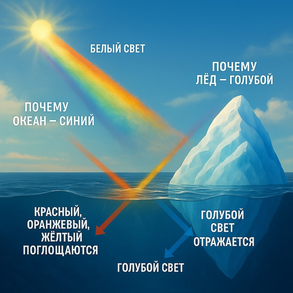 Мы привыкли видеть воду в стакане как прозрачную, но стоит оказаться у берега моря или на леднике — и вода вдруг приобретает ярко выраженный цвет: океан сияет насыщенной синевой, а лёд, особенно древний и плотный, кажется небесно-голубым. Почему так происходит? Всё дело — в физике света и особенностях самой воды. Цвет воды в океане — результат взаимодействия света с молекулами воды. Белый солнечный свет состоит из разных длин волн, каждая из которых соответствует определённому цвету. Когда свет проникает в толщу воды: Таким образом, именно синие волны света «возвращаются» к нашим глазам, создавая характерный цвет. Чем глубже и чище вода — тем насыщеннее и ярче синий оттенок. В водоёмах с большим количеством взвесей, планктона или песка, синий цвет может заменяться на зеленовато-бирюзовый или даже коричневый. Секрет голубого оттенка льда тоже кроется в оптических свойствах воды. Прозрачный лёд, особенно если он плотный и без пузырьков воздуха, начинает вести себя как своего рода фильтр: