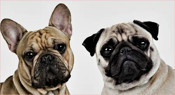 Французские бульдоги тоже имеют плоскую морду, но она более квадратная. Их «летучие мыши» уши стоят торчком, придавая им постоянно удивленный вид. Глаза у френчи тоже большие, но не такие выпуклые, как у мопсов.