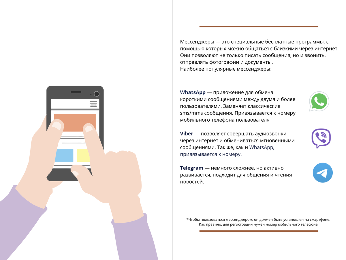 Сегодня быть на связи с близкими стало проще, чем когда-либо. Даже находясь далеко от детей или друзей, вы можете писать, звонить и видеть родных с помощью интернета. Главное — не бояться пробовать. Мессенджеры — это специальные бесплатные программы, с помощью которых можно общаться с близкими через интернет. Они позволяют не только писать сообщения, но и звонить, отправлять фотографии и документы. Наиболее популярные мессенджеры: Чтобы пользоваться мессенджером, он должен быть установлен на смартфоне. Как правило, для регистрации нужен номер мобильного телефона. Чтобы мессенджеры работали, смартфон должен быть подключён к интернету. Существует два основных варианта: Как узнать, что интернет подключён: Если вы не знаете, как подключиться — лучше всего настроить Wi-Fi дома с помощью детей, внуков или специалистов в салоне связи. Это удобно и безопасно.