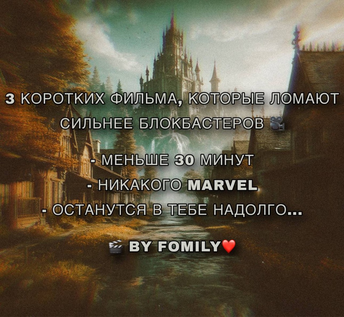 🎥 FOMily СМОТРИТ 3 коротких фильма, которые трогают сильнее блокбастеров ⸻ Не всегда нужен Голливуд, чтобы взломать сердце. Иногда достаточно 10 минут, одной комнаты и честной истории. Вот три короткометражки, которые ты точно досмотришь до конца — и подумаешь после. ⸻ 1. «Соседи» / Neighbours (1952) 🕰 8 мин. 🎬 Режиссёр: Норман Макларен ⚡️ Немое кино с мощным антивоенным посланием. Без слов — только действия, которые говорят громче криков. 📺 Смотреть на YouTube ⸻ 2. «Нахлебник» / The Lunch Date (1989) 🕰 10 мин. 🏆 Оскар за лучший короткометражный фильм ⚡️ Женщина сталкивается с бездомным в кафе. То, как меняется восприятие — страшно, стыдно и по-человечески сильно. 📺 Смотреть на YouTube (с русскими субтитрами) ⸻ 3. «Мост» / Most (2003) 🕰 29 мин. 📍 Чешско-американский фильм ⚡️ Отец работает оператором железнодорожного моста. Один день — одна трагедия — и ты больше не сможешь забыть эту историю. 📺 Смотреть на YouTube (с субтитрами) ⸻ 💬 Эти фильмы короткие, но не