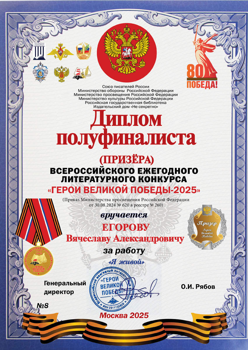 Все вы, дорогие мои читатели, знаете о моей победе во Всероссийском ежегодном патриотическом литературном конкурсе "ГЕРОИ ВЕЛИКОЙ ПОБЕДЫ 2024. В прошлом году я отправлял на конкурс свой стих "Сон о бое". В этом году я снова решил принять участие в этом престижном конкурсе и направил жюри стих "Я живой". Напомню, что в 2024 году я выпустил сборник стихов с таким же названием - "Я живой". И вот сегодня мне прислали Диплом полуфиналиста конкурса! До финала еще далеко и неизвестно, попаду ли я в финал в этом году, но уже попадание в полуфинал - это очень важное, очень значительное событие для меня!!! Выражаю огромную благодарность организаторам конкурса и жюри! Ну и, как бы там ни было, надеюсь на выход в финал! P.S. Приобрести сборник стихов "Я живой" вы можете, написав мне в личные сообщения. Буду рад отправить вам книгу, поделившись своими стихами, своими мыслями. Вячеслав Егоров, июнь 2025 год. #ВячеславЕгоров #ГероиВеликойПобеды #ГВП #конкурс #стихи #полуфинал