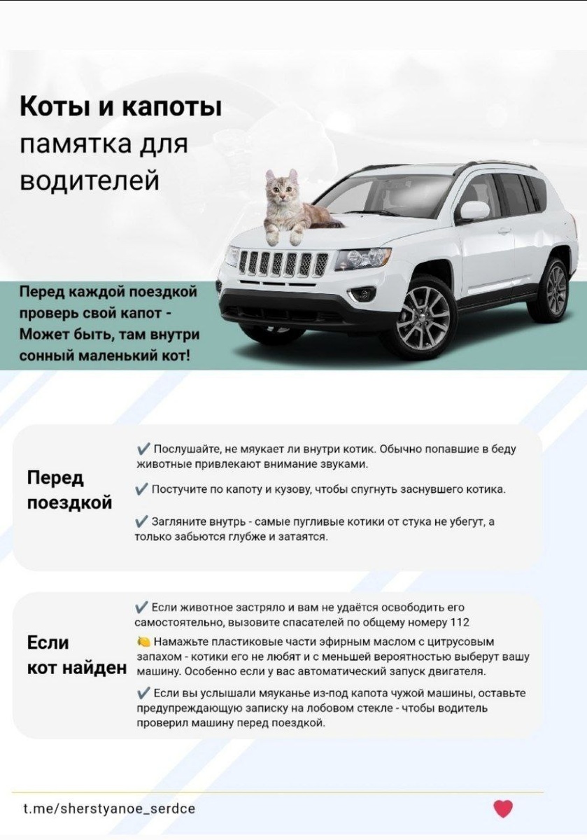 Летом тоже очень много котят залезает под капоты. В лучшем случае, животное уедет в другой район. В худшем - получит серьёзные травмы или даже может погибнуть. Кто за рулём - пожалуйста, проверяйте капот перед поездкой. Я подумываю о том, чтобы развесить объявления ни парковках.
