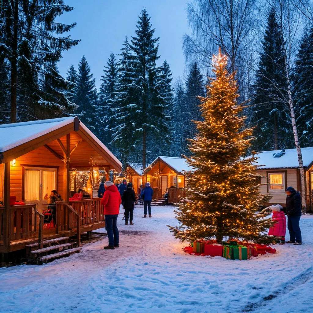 Вокруг царило веселье, играла музыка. Кто-то кидался снежками, кто-то строил снеговиков и другие снежные фигуры, кто-то устроил танцы, а большая ёлка, стоявшая чуть в стороне от коттеджей, была вся увешана игрушками и мишурой.