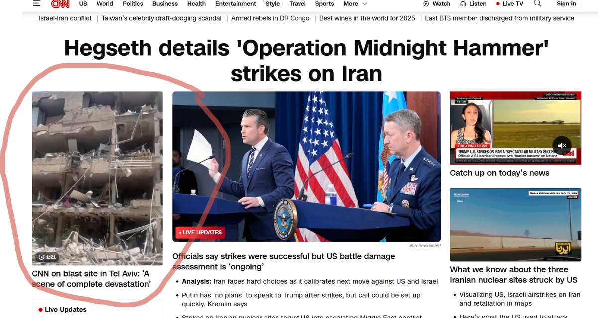 Первая полоса CNN. Жирный заголовок предлагает читателю погрузиться в детали "блестящей операции". Первые сообщения о которой гласили: цели достигнуты, ядерная программа уничтожена. Символично, что здесь же крутят кадры ответного удара со стороны Ирана. Развалины где-то в Тель-Авиве до боли напоминают Сектор Газа, который под предлогом спасения заложников и борьбы с группировкой ХАМАС Израиль утюжит уже почти два года. Спустя несколько часов в репликах официальных лиц Вашингтона уже нет той уверенности. Действительно ли цель достигнута? Опубликованные снимки со спутника демонстрируют лишь какие-то следы на скалах. Но что там под ними?