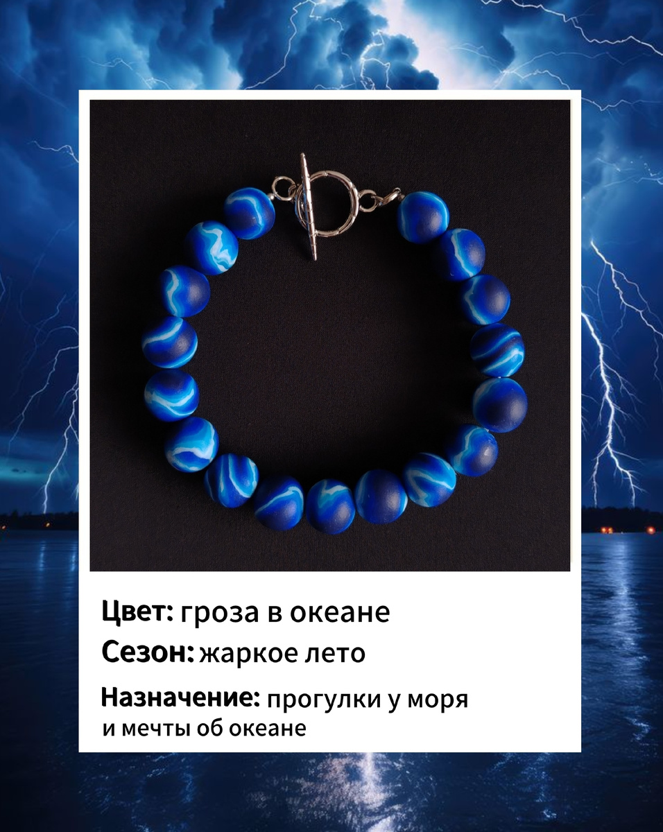Браслет, который поможет визуализировать мечту попасть на океан, а именно в грозу на океане😁 Главное, чтобы вы были в это время в безопасном месте и наблюдали все это буйство исключительно со стороны. Ну а потом искупались в океане, когда он успокоится🙂 Ох, пока писала, сама на океан захотела😁 Пока что была только на море. А вы?? Кто-то из моих подписчиков был у океана? Поделитесь! Браслет из полимерной глины, на ювелирном тросике. Замочек с родиевым покрытием, гипоаллергенный. Так какие у вас отношения с океанами?😉
