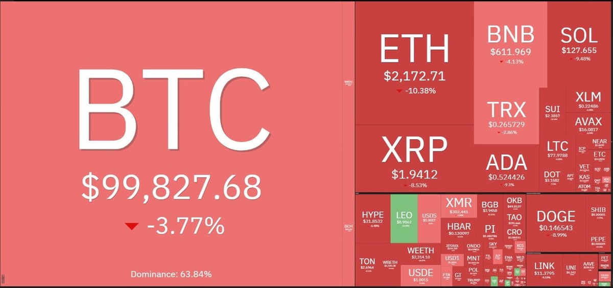 BTC ниже $100k, ETH ниже $2 200 🔽