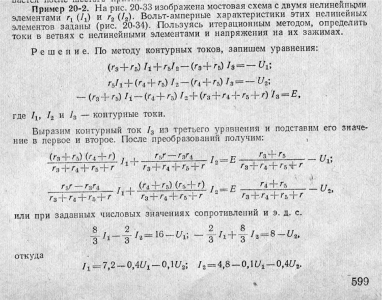 Ниже приводится самый давний пример расчёта итерационным методом, взятого из учебника для ВУЗа - 1975 года (л.2), в котором на рис.20-33 показана небольшая электрическая схема, где сопротивления R1 и R2 - нелинейные. Остальные сопротивления - линейные. Схема работает на постоянном токе. Вольт-амперные характеристики нелинейных сопротивлений R1 и R2 заданы на рис.20-34. Отличительной особенностью этого метода является успешное применение в итерационном процессе статического сопротивления Rст, рассчитываемого по данным соответствующей ВАХ.