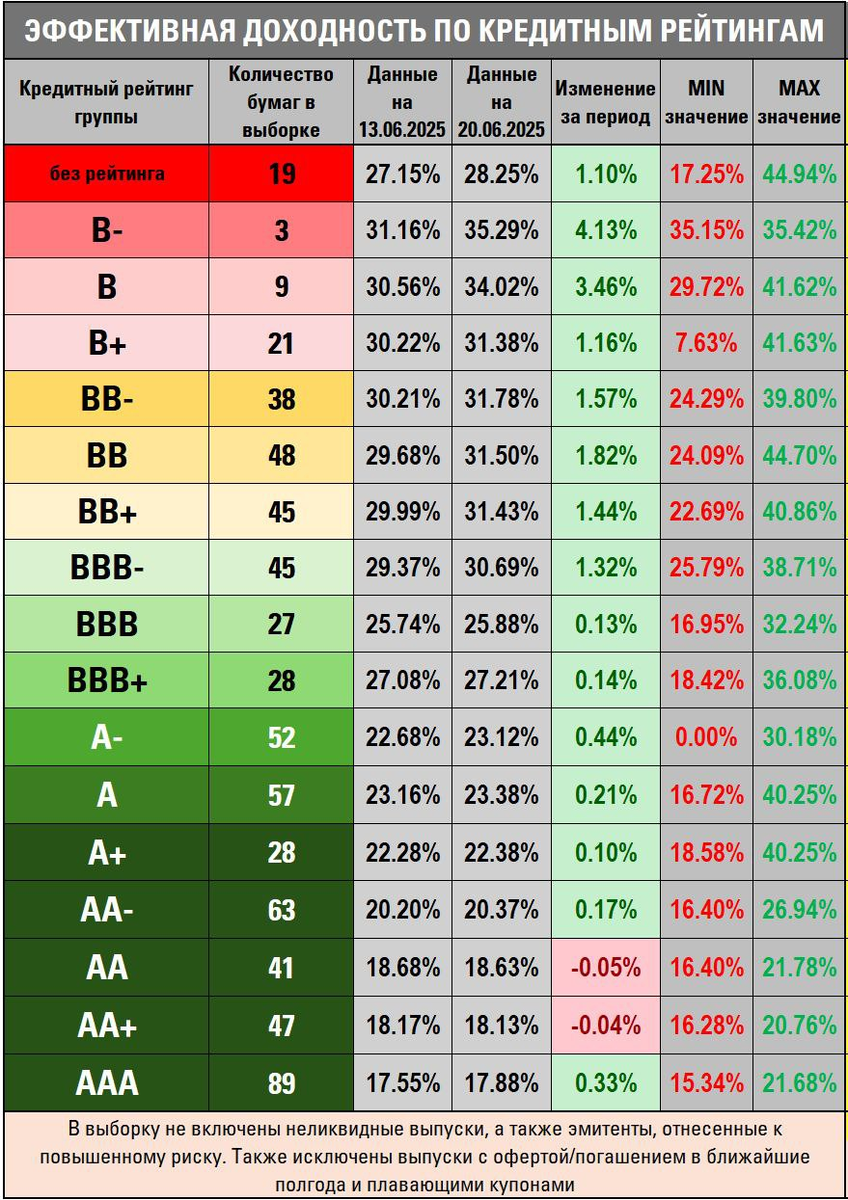 2️⃣1️⃣☀️0️⃣6️⃣☀️2️⃣0️⃣2️⃣5️⃣ (версия пессимиста) ⛑ Доброго дня, уважаемые читатели! Обычный еженедельный пост сегодня оборудован необычной логикой) 😊 Во-первых, в таблице лидеров доходности рейтинговой группы я не проводил никакую фильтрацию - если у эмитента два рейтинга, его бумага может повторяться. Если несколько выпусков в лидерах - все они на скриншоте. Во-вторых, смотреть на все это великолепие мы сегодня будем с точки зрения рисков - именно выпуски с наибольшими доходностями сейчас отлично показывают, откуда убежали многие участники рынка после недели повышенной дефолтности. 🤖 Небольшой пролог - средняя доходность по всем группам выросла больше, чем на процент. Но невооруженным глазом заметно, что высоких рейтингов этот рост почти не коснулось, а вот в ВДО бушуют ураганы. Поэтому давайте потихоньку пройдемся по списку. ⚠️ Еще раз повторюсь, что мы сегодня смотрим на лидеров с точки зрения максимального беспокойства широкого рынка, и, как следствие, повышенного страха дефолтн