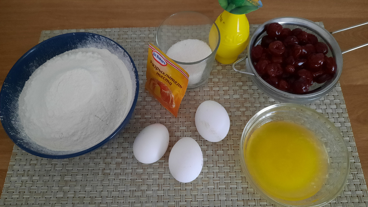 Дело было вечером- делать было нечего.. Испекла пирог быстро и просто. Все продукты на глаз, ничего не взвешивала но зато получился пышный и воздушный пирог на быструю руку... На вид может и не очень, но на вкус получился отличный ! Все, что было под рукой, это : - Три яйца, примерно 80 г. сахара, пол- пачки масла сливочного, 1 ч.л. лимонного сока, немного замороженной вишни, муки примерно 250 грамм, разрыхлитель, 3 ст.л. сметаны было в холодильнике.. и все пожалуй. В первую очередь разбила три яйца... посыпала сахаром, добавила щепотки соли .. и хорошенько все взбила венчиком... добавила остатки сметаны... в холодильнике всего три ложки.. и еще влила в эту массу растопленное сливочное масло... все перемешала, добавила муки и разрыхлитель и все перемешала лопаткой до однородной массы.. Получилась довольно густая масса... вишню перемешала с 1 чайной ложкой сахара и 1 ложкой крахмала ... Всю массу вылила в форму диаметром 22 см. , сверху равномерно выложила вишню и все готово к выпе