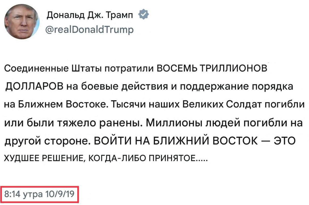 Трамп в 2019 году: ⚡️«Худшее решение, когда-либо принятое». Трамп раскритиковал вступление США в войну на Ближнем Востоке Об этом президент США заявил в связи с выводом американских войск из северной Сирии По мнению Трампа, США вступили в войну по сфабрикованным основаниям в лице наличия у Ирака оружия массового уничтожения, но в результате лишь потеряли своих солдат и потратили много денег Трамп отметил, что Америка больше никогда не повторит ошибок прошлого и не сунется в войны на Ближнем Востоке: «США никогда вообще не следовало быть на Ближнем Востоке. Глупые бесконечные войны для нас закончены!», — заявил он. Этот же твит можно публиковать и про самого Трампа образца 2025 года.
