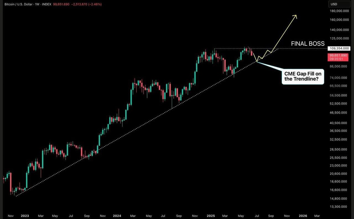 BTC Недельный график Если $BTC заполнит пробелы CME, он может выровняться с восходящей линией тренда, которая сохраняется с начала бычьего цикла в конце 2022 года. Повторное тестирование этой линии тренда может привести к сильному отскоку, потенциально запуская цену в финальную фазу бычьего ралли.