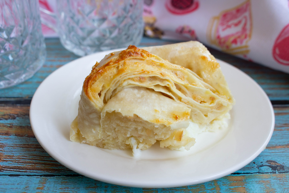 Быстрый вариант завтрака, полдника или перекуса в течение дня. Такая плетенка одинакова хороша и с чашкой горячего чая и со стаканом холодного молока. Сладость начинки всегда можно скорректировать по своему вкусу, добавить больше или меньше сгущенки. Орехи можно использовать и другие. Творог для приготовления нужен мягкий или можно измельчить его через сито, через мясорубку или воспользоваться блендером. Плетенка получается мягкая, вкусная, сладкая, а готовить ее проще простого. Лаваш - 1 шт. Творог - 150 г. Сгущенка - 3-4 ст.л. Кешью - 10 шт. Молоко - 2 ст.л. Яйцо куриное - 1 шт. Творог выложим в чашку, кешью измельчим и добавим к творогу. Кешью я выкладываю в пакет и прокатываю скалкой. Добавим в чашку сгущенку. Тщательно перемешиваем начинку. Распределяем творожную начинку тонким слоем по лавашу. Сворачиваем лаваш рулетом и разрезаем его вдоль не до конца. Перекручиваем полосы лаваша между собой, формируем плетенку и выкладываем ее в форму для выпечки. Яйцо вбиваем в чашку, смешивае