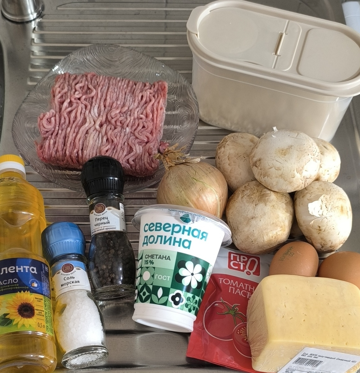 Этот рецепт не потребует от вас много труда и экзотических продуктов. Такая запеканка хорошо держит форму, а ее приятный привкус заставит просить добавки даже самого привередливого едока. К тому же такая запеканка поможет оживить рис, оставшийся от предыдущей трапезы. Ингредиенты: - рис 1 стакан - фарш мясной (любой) 400 грамм - лук репчатый 100 грамм - яйцо куриное 2 штуки - сыр твердый 100 грамм - шампиньоны 250 грамм - томатная паста 70 грамм - соль, ваши любимые специи и черный молотый перец по вкусу - масло растительное для жарки и смазывания формы 30-40 грамм Рис сварить до готовности любым удобным вам способом. Грибы хорошо промыть, освежить срез и нарезать мелким кубиком. Лук очистить и нарезать мелким кубиком. Обжарить лук в хорошо разогретом растительном масле до лёгкой золотистости. Добавить грибы. Обжарить овощи до полного выпаривания жидкости. Добавить фарш. Обжарить до готовности фарша, постоянно помешивая и разбивая фарш лопаткой на мелкие кусочки. Добави