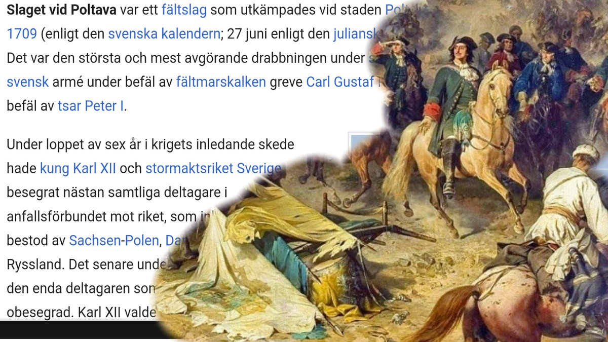 Открываю статью "Slaget vid Poltava". И с первых строк чувствую: тон совсем иной. Никаких восторгов, никаких трагических метафор. Факты, аналитика и... ощущение дистанции. Как будто рассказывает не очевидец битвы, а историк, которому важно сохранить хладнокровие, честно не ожидал, думал как обычно - русские напали, русские агрессоры (хотя может просто руки пока не дошли и поправят в нынешнем европейском стиле).