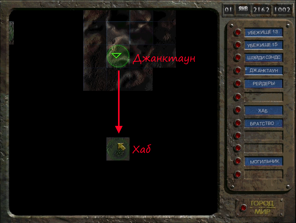 После полного сумасшествия в Джанктауне мы направляемся на юг. Наша цель — город под названием Хаб. Он по сути является крупным торговым центром и перевалочным пунктом для торговцев. Здесь можно найти много интересного, если у вас есть чем платить. Но если надеяться, что в Хабе меньше сумасшествия, чем в Джанктауне, можно очень даже ошибиться.
