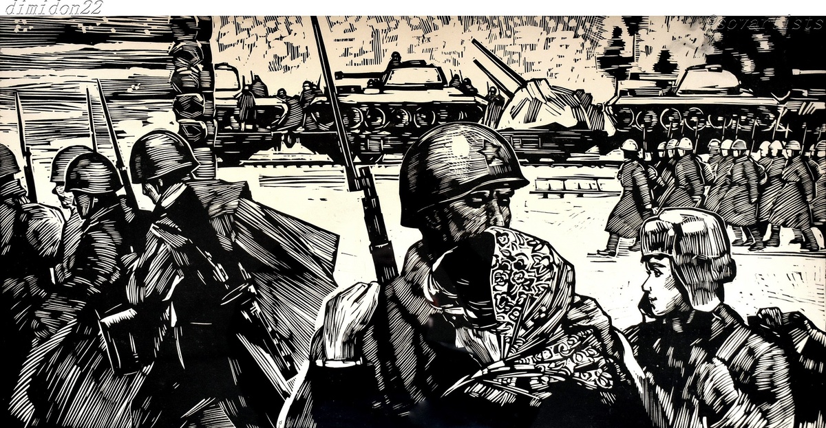 Никитин Сергей Алексеевич (13.10.1930, Мучкап Центрально-Чернозёмной области - 28.10.2008, Тамбов). «Проводы на фронт». 1964 год. Бумага, линогравюра; 375 х 740 мм.; (Мичуринский краеведческий музей Тамбовской области).