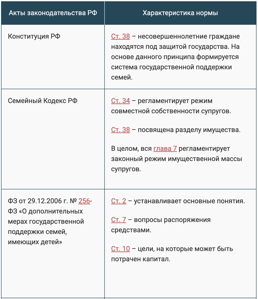 Вопросы раздела квартиры в материнском капитале, и реализации мер по поддержке государством семей, отличаются повышенной важностью. Именно поэтому на государственной уровне разработана система нормативных актов, регламентирующих процесс распределения недвижимости. Для полноценного понимания сути правовой основы, можно обратиться к приведенной ниже таблице.