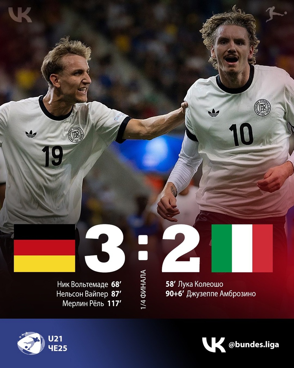 Но сборная Германии всё-таки дожала бедных и уставших ДЕВЯТЕРЫХ итальянцев на 117 минуте и вышла в полуфинал турнира в Словакии 🔥👏