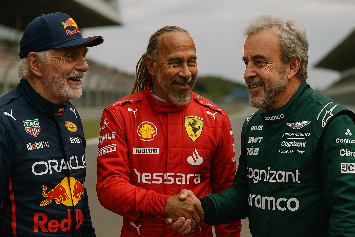 Седой джентльмен в комбинезоне Ferrari — не шутка, а образ. Всё ещё харизма, всё ещё стильно. Кажется, он сейчас даст интервью CNN о технологиях веганского топлива.